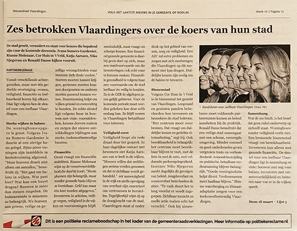 Afgelopen week verscheen in het Nieuwsblad Vlaardingen een uitgebreid interview van een halve pagina met zes kandidaten van Leefbaar Vlaardingen: Ivana Somers-Gardenier, Rianne Molenaar, Cor Huis in ’t Veld, Katja Aarsen, Niko Njegovan en Ronald Danse. In deze interviews deelden zij ieder op hun eigen manier hun betrokkenheid bij de stad, hun motivatie en hun ambities voor de toekomst van Vlaardingen.